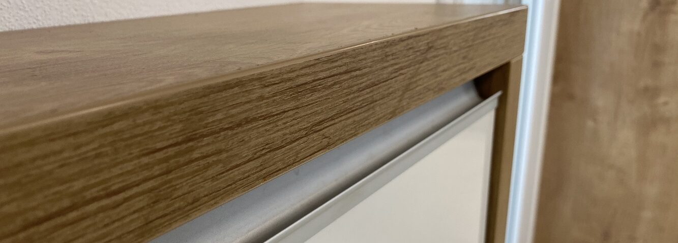 Jednoduchý botník s korpusem z matného lamina Dubu Halifaxu přírodního. Čela výklopů jsou z matného bílého lamina s podélně zafrézovanými úchytkami UK5 v odstínu hliníku.