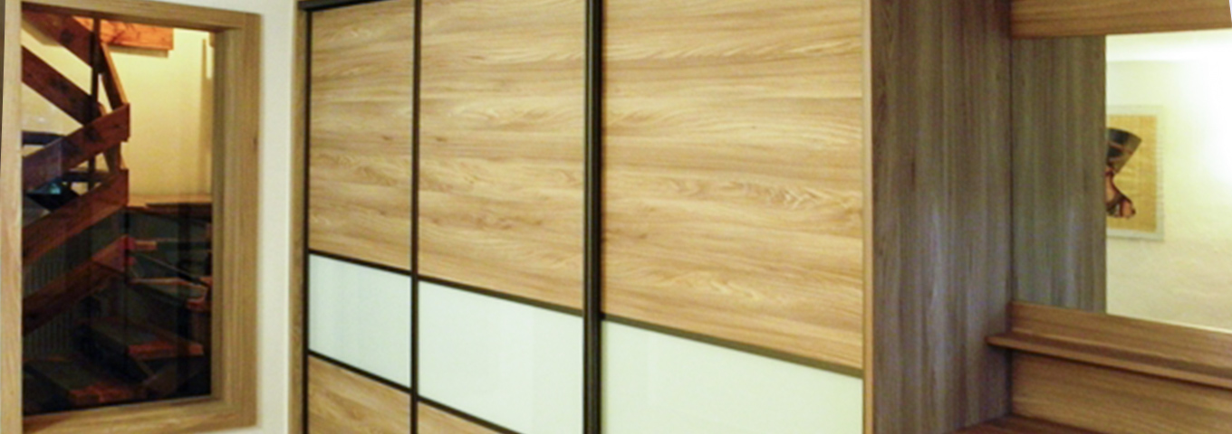 Vestavěná skříň, věšáková stěna s botníkem a atypické prosklení schodiště v zádveří z lamina odstín Jilm natur s posuvnými dveřmi s výplní z lamina Jilm v kombinaci s designovým skle Lacobel