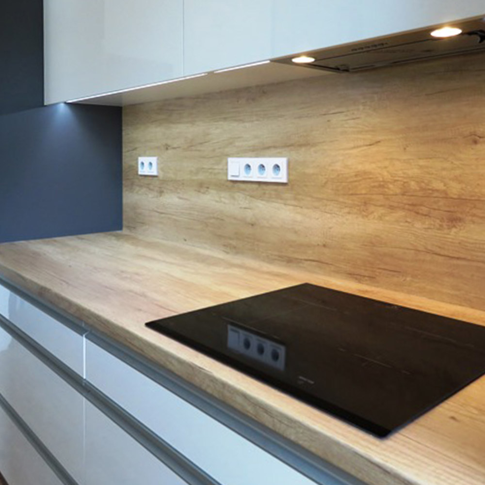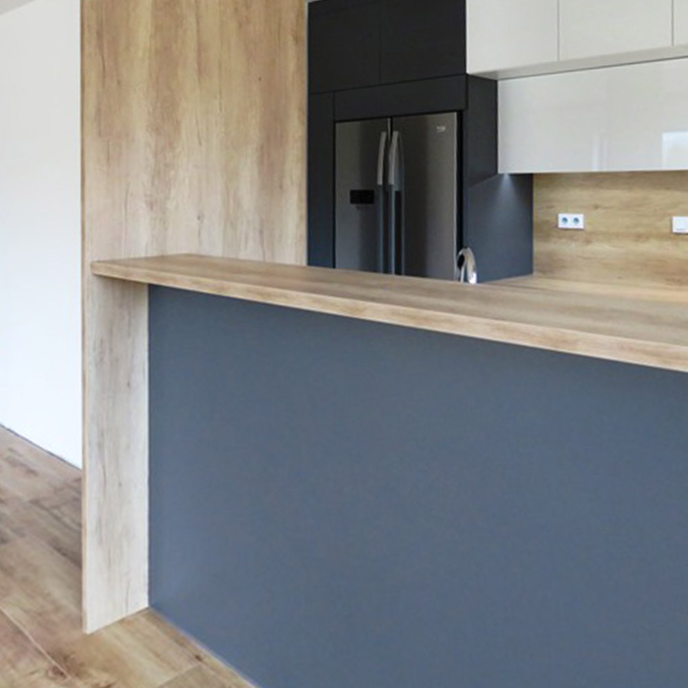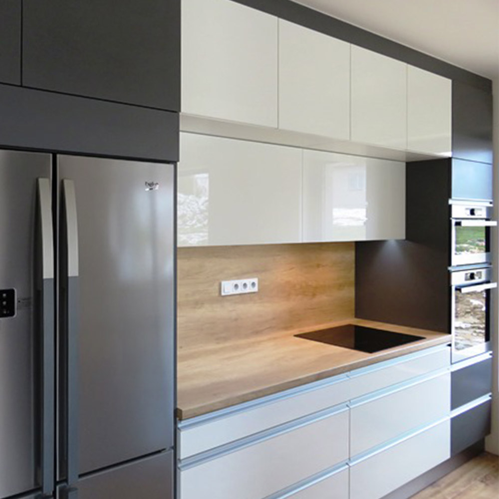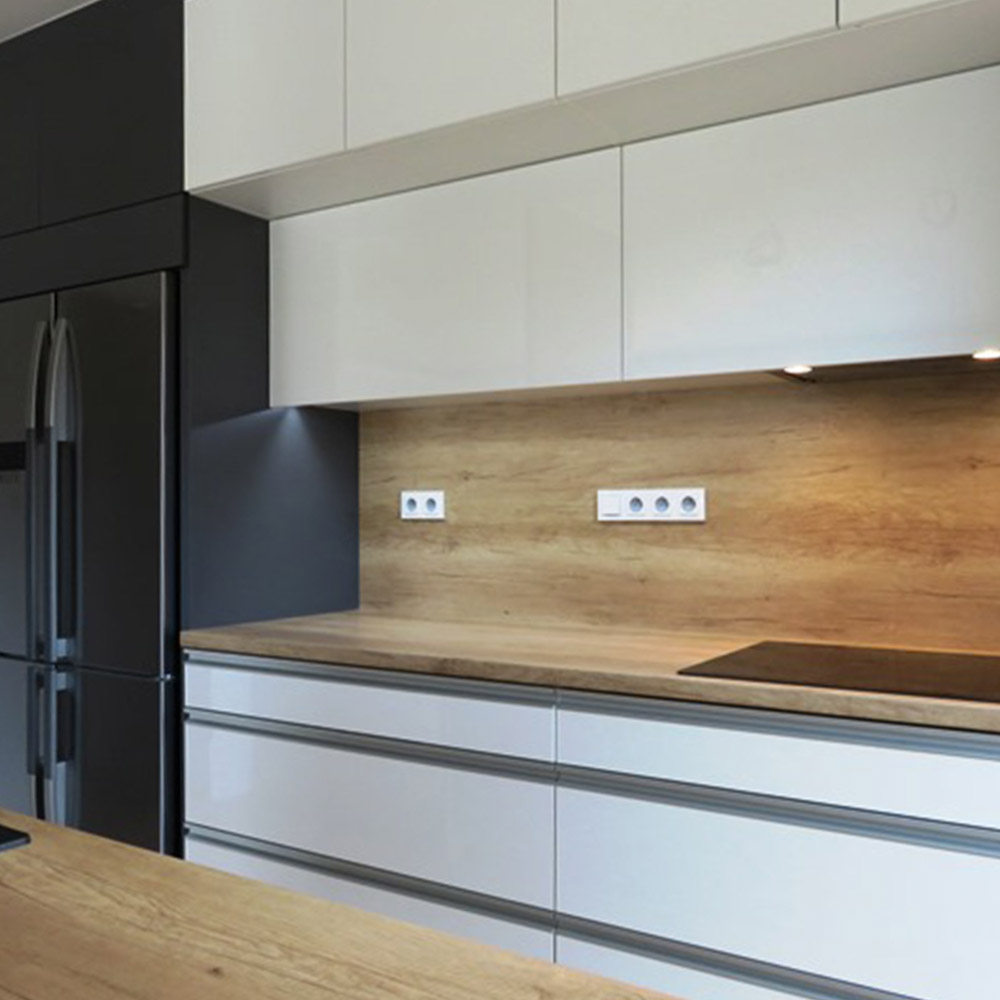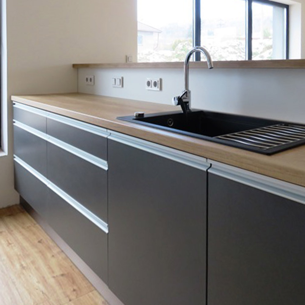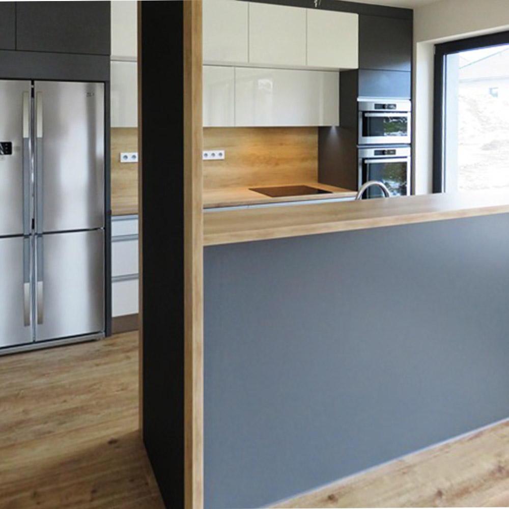 Nadčasová kuchyňská linky v odstínech bílého lesklého lamina a antracitové šedé, doplněna pracovní deskou a zadním obkladem za kuchyňskou linkou v dřevodekoru, konkrétně Dub Halifax přírodní. Elegantní čistý design doplňují podélně zafrézované úchytky UK7 v odstínu hliníku. Spotřebiče jsou v odstínu stříbrné, doplněné stříbrným soklem pod celou kuchyní.