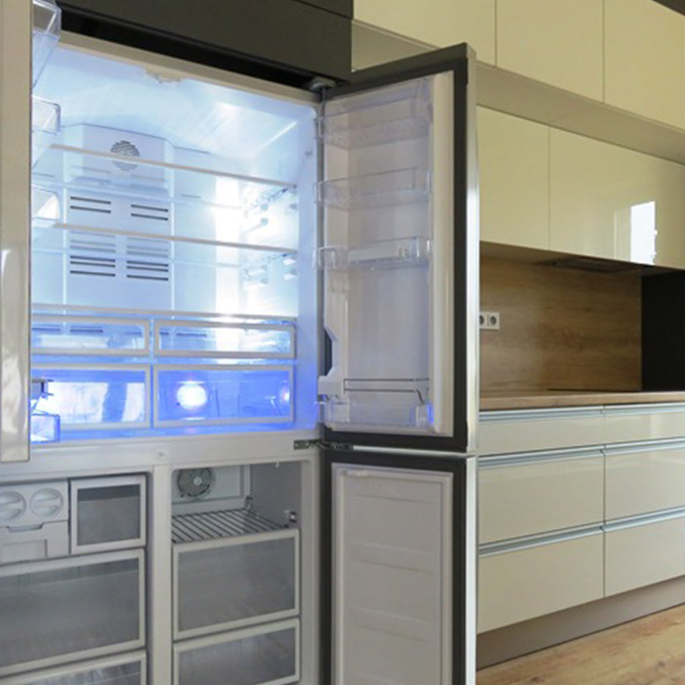 Kuchyňská linka s korpusy z matného lamina. Dvířka kvalitní bílý lesk dle výběru zákazníka. Pracovní deska Postforming Dub Nebraska. Úchytky podélně zafrézované hliníkové. Použité kování od firmy Blum, Grass. Součástí dodávky kuchyňské linky jsou spotřebiče WHIRLPOOL, BEKO.
