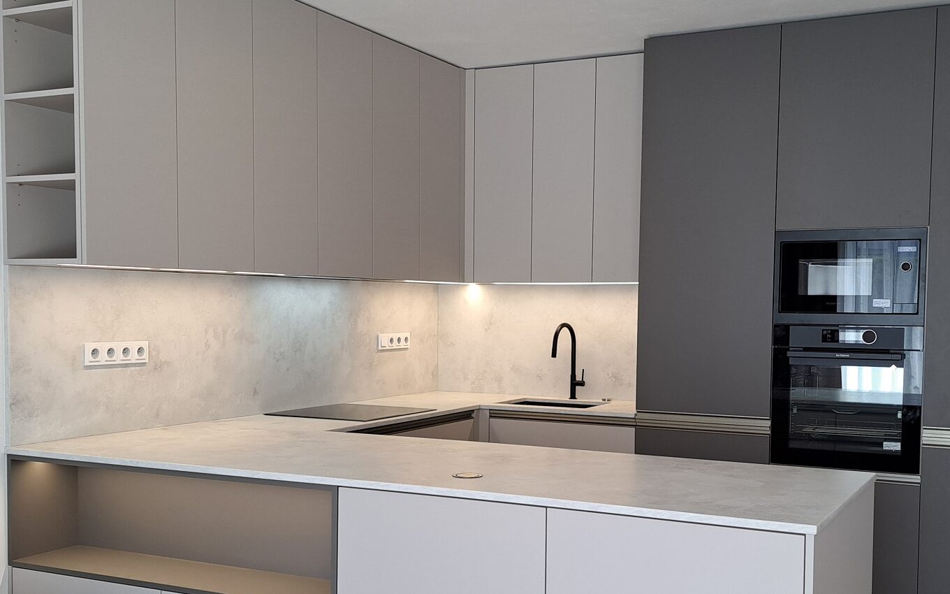 Tato luxusní kuchyňská linka je navržena v elegantní antracitově šedé v kombinaci s jemnou světle šedou barvou. Celá kuchyně má speciální protiotiskovou povrchovou úpravu PerfectSence. Kuchyňské lince dominuje elegantní pracovní deska z kamene od výrobce Technistone. Je zde netradiční spodní uložení dřezu pod pracovní deskou. Dřez i baterie jsou od špičkového výrobce na trhu Schock. Jsou zde použity moderní zafrézované úchytky UK7 v odstínu nerezu, které doplňují nadčasové spotřebiče francouzského výrobce DeDietrich v provedení černé barvy s doplňky v odstínu nerezu. Tato kuchyňská linka byla realizována v rodinném domě v Liberci pod Ještědem.