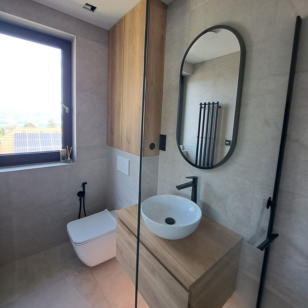 Minimalistické skřínky do koupelny jsou navrženy v odstínu dřeva, který koresponduje s obkladem koupelny. Skřínky jsou vybaveny moderním bezúchytkovým systémem.