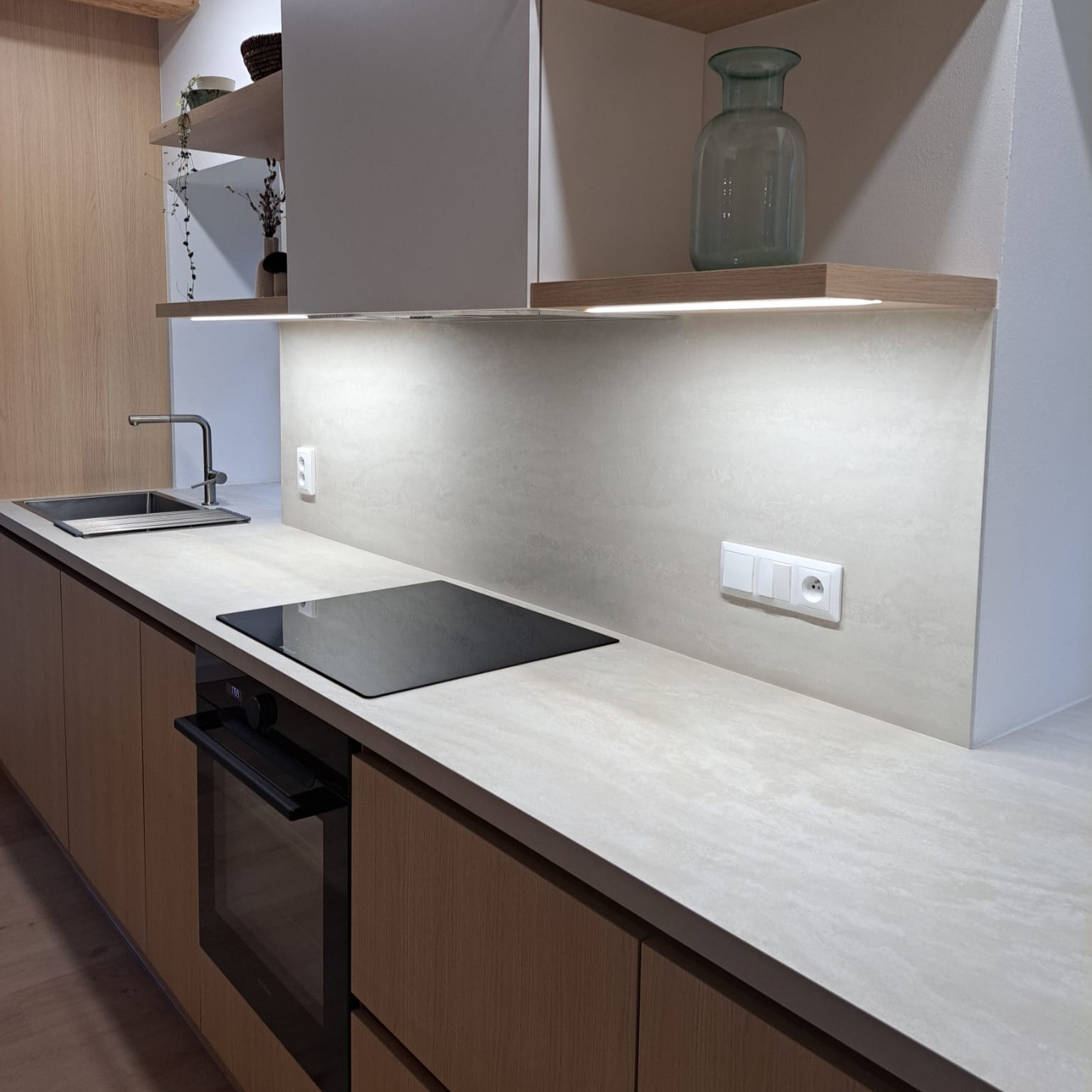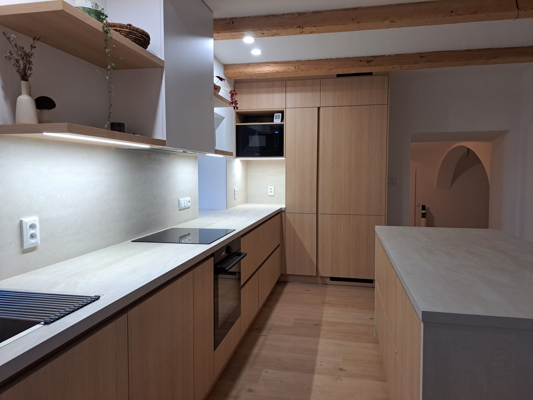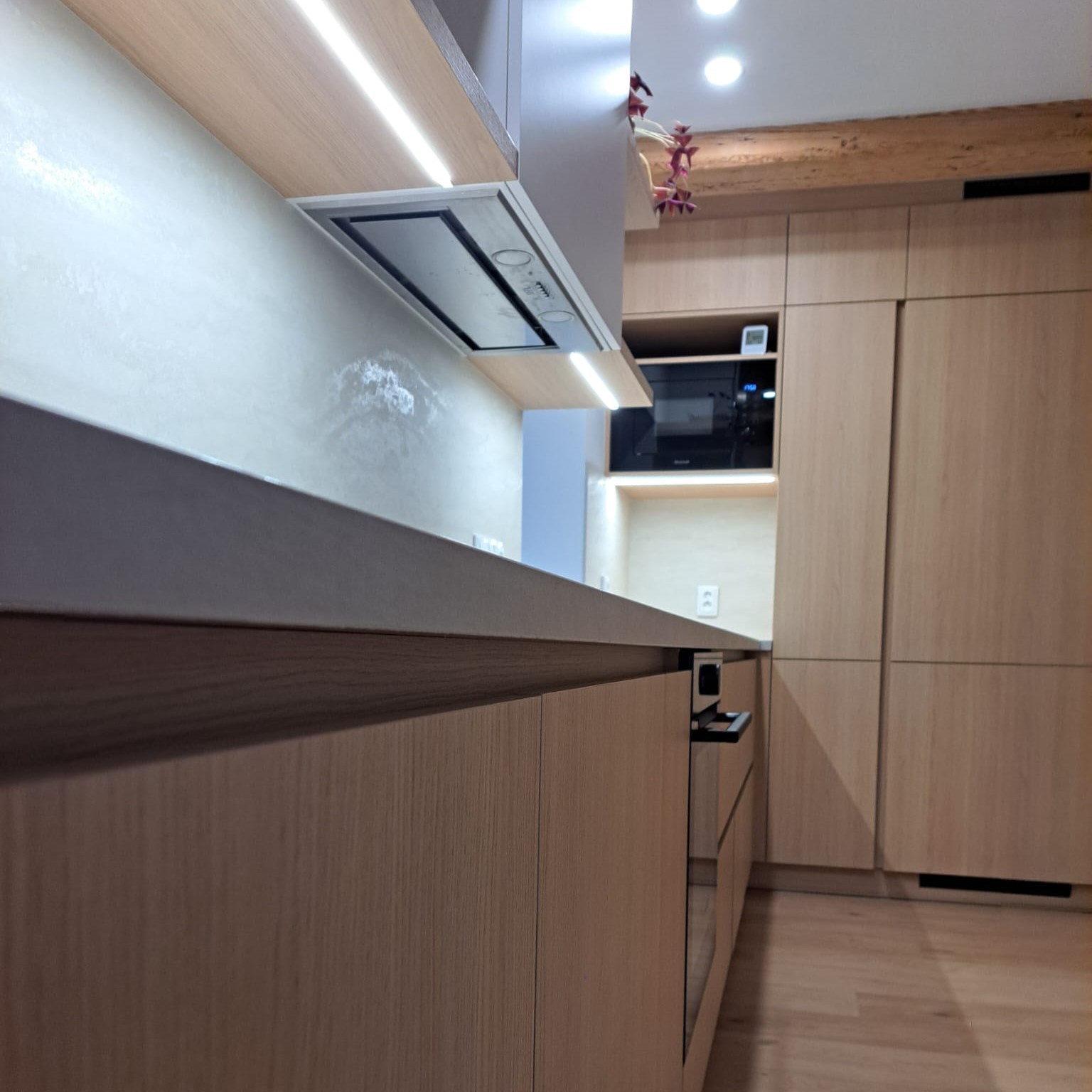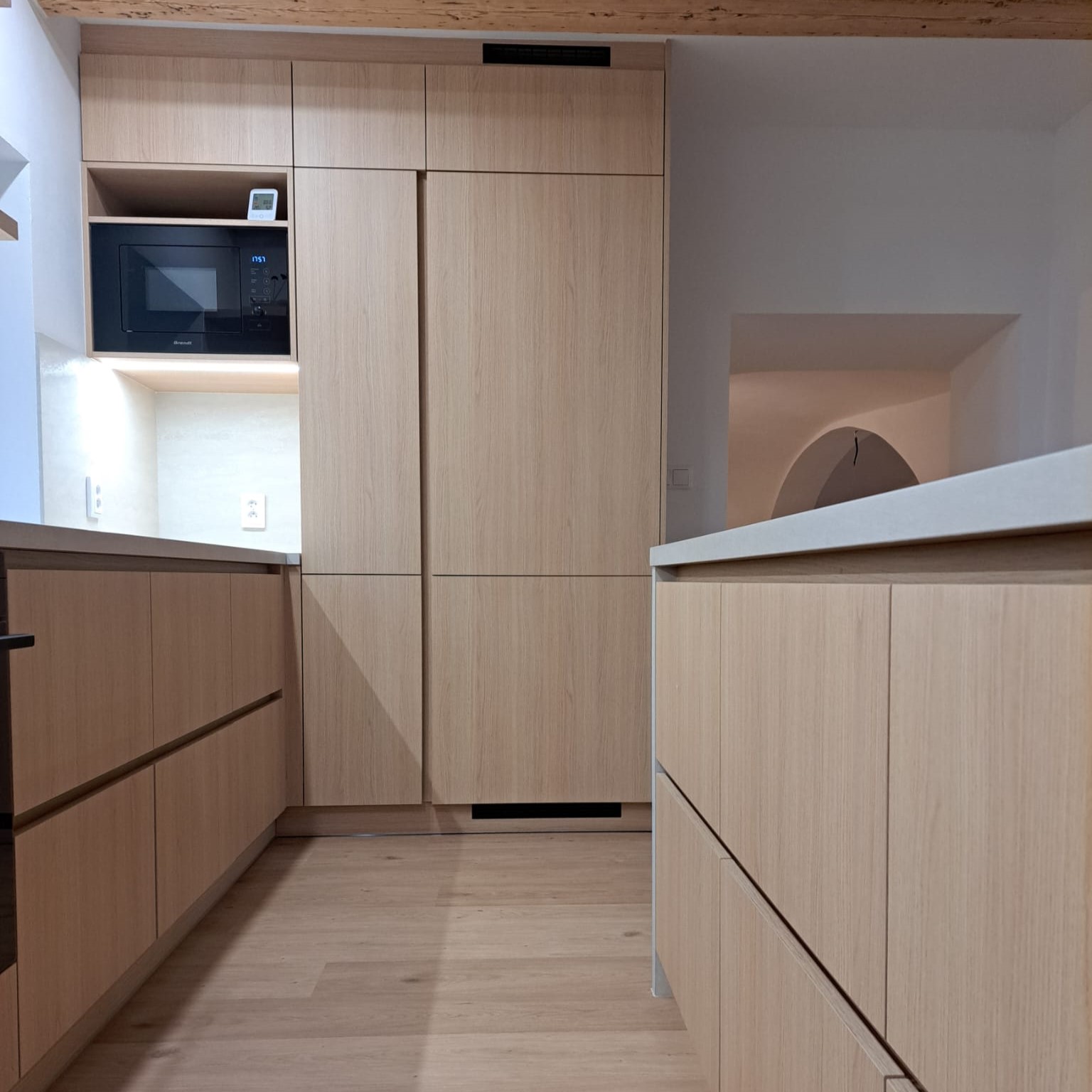 Tato kuchyň na míru nabízí elegantní řešení úchytek, dvířka jsou jemně snížená a prostor za nimi je chytrým způsobem uzpůsoben pro pohodlné a snadné otevírání. Tímto promyšleným řešením vznikla jedinečná kuchyně s čistým, bezúchytkovým designem. Na skříňky byl zvolen dřevodekor Dub Vicenza, který elegantně doplňuje pracovní desku s odstínem Světlá stěrka. Přírodní kombinace barev vytváří harmonický a nadčasový vzhled, který působí útulně a moderně zároveň. Kvalitní kování značky Blum zaručuje dlouhou životnost a pohodlné každodenní používání.