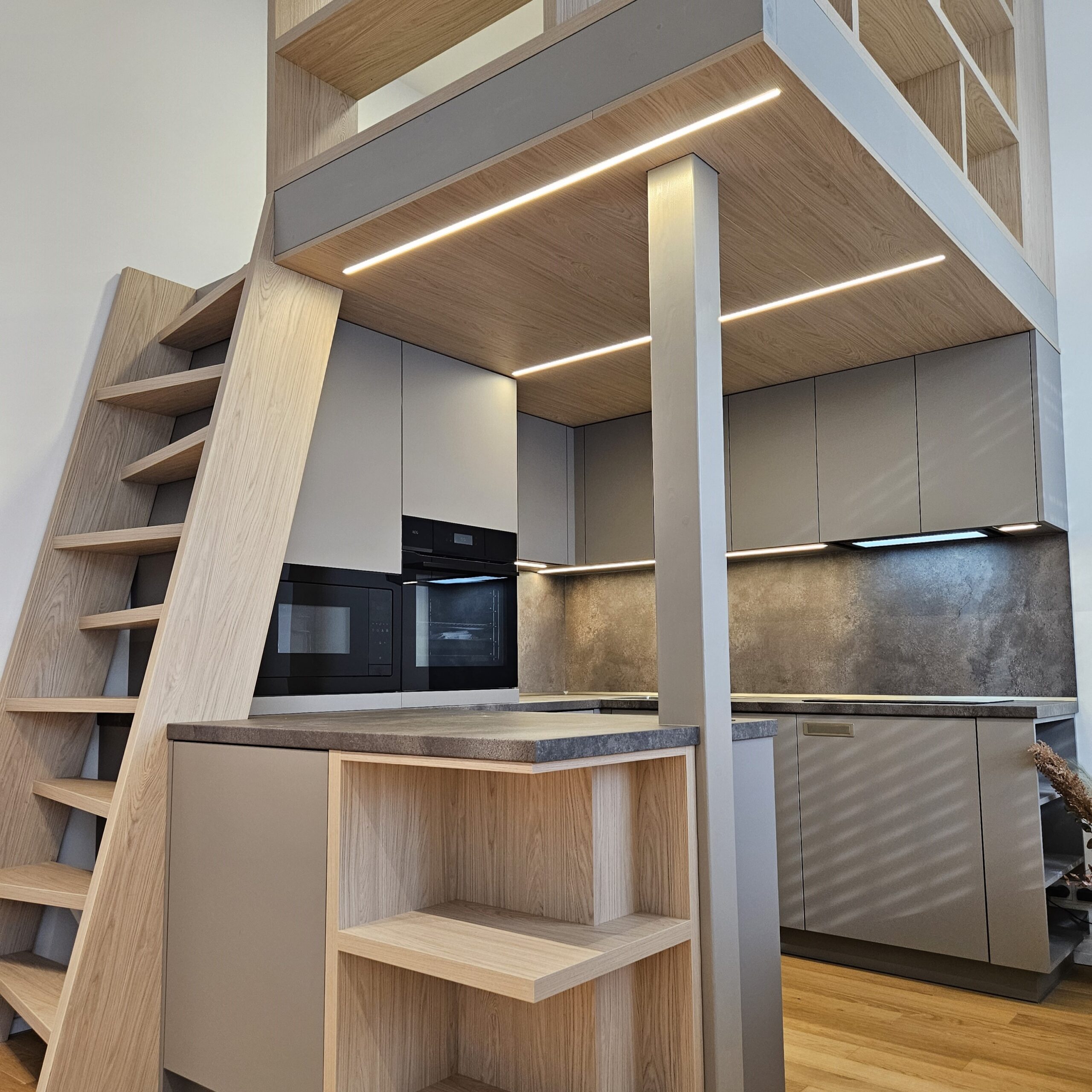 Atypická kuchyně s patrem – Praha Kuchyně s netradičním řešením prostoru, kde je nad hlavní částí navrženo spací patro s knihovnou, které efektivně a elegantně rozšiřuje využití celého prostoru. Kombinace materiálů vytváří klidný, vyvážený celek s důrazem na čisté linie a materiálovou návaznost. Precizní zpracování, kvalitní kování a propracované detaily podtrhují nadčasový výraz celého prostoru. Bylo nám potěšením být součástí této realizace a velmi si vážíme projevené důvěry.
