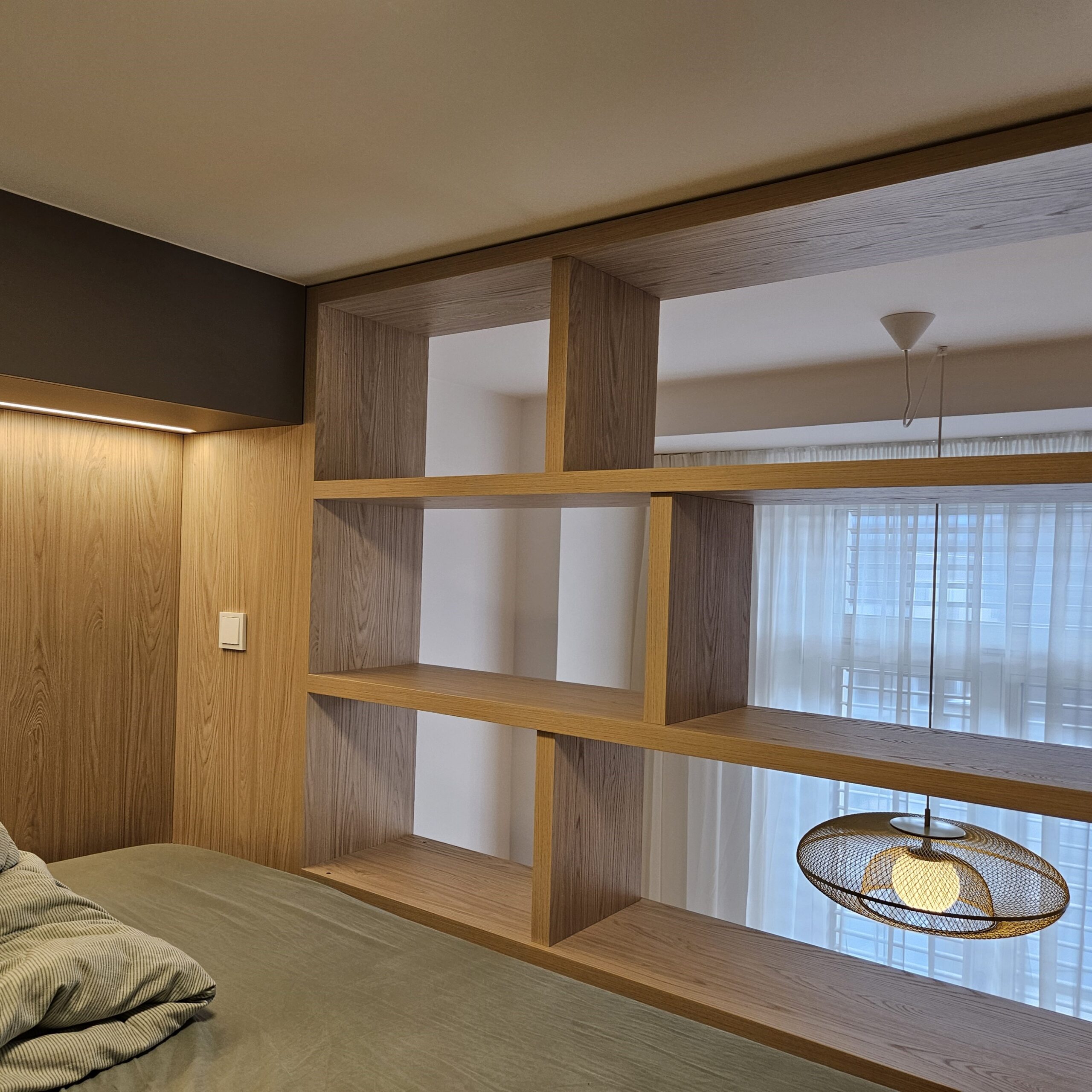 Kuchyně s patrem, na kterém vznikl plnohodnotný spací prostor s knihovnou Chytré řešení, které elegantně pracuje s výškou místnosti a posouvá možnosti interiéru na novou úroveň. Důraz byl kladen na maximální využití prostoru bez kompromisů v pohodlí a estetice. Vestavěné prvky na sebe přirozeně navazují a podporují celkovou vzdušnost i praktičnost interiéru. Precizní zpracování doplňuje kvalitní kování rakouské značky Blum, které zajišťuje dlouhou životnost a komfort při každodenním používání.